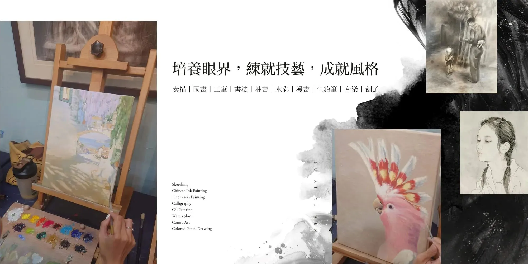 美術課程包含素描、水彩、油畫、國畫、書法、漫畫、作品集指導、比賽、升學